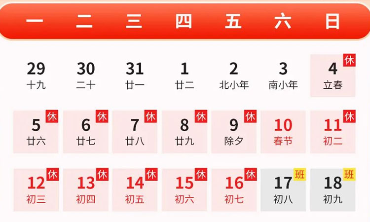 在此期間,公司將暫停辦公,部分服務可能受到一定影響,敬請諒解。如果您有緊急事務或需要協助,可隨時通過撥打電話159-8189-6886,隨時為您提供服務。衷心感謝您對我們工作的理解與支持。在新的一年里,我們將繼續努力提供更優質的服務,為您創造更多價值。祝您和您的家人在新的一年里身體健康、幸福安康,闔家團圓,萬事如意!